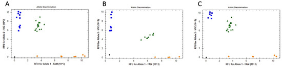 Allelic discrimination plot for (A) rs 1024939, (B) rs 713598 (C) rs 1726866 using TaqMan genotyping assays on 96 well plates. Blue squares and orange circles represent homozygous genotypes, whereas green triangles represent heterozygous genotypes. No template control (NTC) is marked as black diamond.