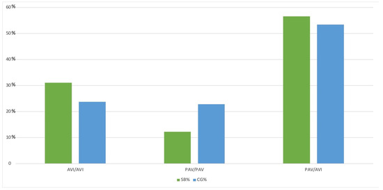 The haplotypes PAV and AVI were the only haplotypes determined in the study. The frequency of the observed haplotypes of the TAS2R38 bitter taste gene polymorphism was not significantly different from the Hardy–Weinberg distribution (chi2, 1 degree of freedom, HW-E p = 0.0528). We detected “3” from the possible 28 diplotypes in both studies and control groups. In the control group, the PAV/AVI genotype was the most frequent (53.5%), followed by AVI/AVI (23.7%) and PAV/PAV (22.8%). The distribution of examined haplotypes in the study group was similar. However, the PAV/PAV diplotype was significantly less frequent (PAV/AVI = 56.6%, AVI/AVI = 31.1%, PAV/PAV = 12.3%; p = 0.01). Despite the slightly higher prevalence of the AVI/AVI homozygote in the control group compared to PAV/PAV homozygotes, PAV/PAV was chosen as the reference genotype because PAV haplotype is more frequent in the global population [27]. Heterozygotes PAV/AVI, the most common in the general population, were also the most frequent in our study both in the study and the control group. The possibility of PAV/AVI diplotypes in the study group was 1.97 times higher than PAV/PAV diplotypes (OR = 1.97; p = 0.0360). AVI haplotype carriers were twice as frequent in the study group (OR = 2.11; p = 0.01611). Also, AVI/AVI homozygotes were twice as frequent in the study group compared to the control group (OR = 2.44; p = 0.01). By analyzing the probability of the occurrence of individual haplotypes on each chromosome, we showed that the rates of AVI haplotype were almost 1.5 times higher in the study group than in the control group (OR = 1.43; p = 0.0204). That means that carrying the AVI haplotype might increase the risk of developing CRSwNP (Table 2). The distribution of diplotypes is shown in Figure 3.