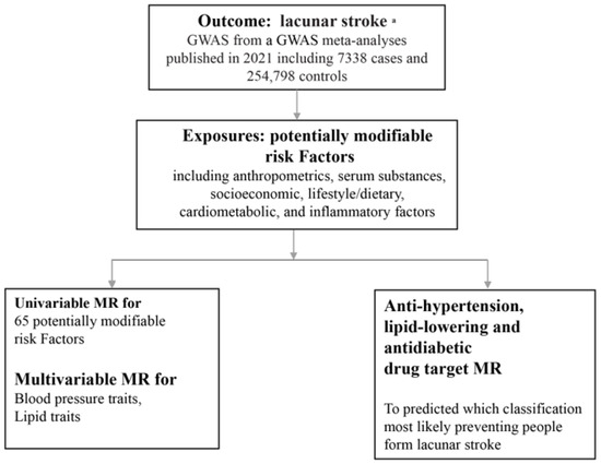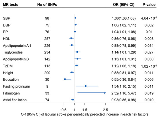 We searched PubMed for published genome-wide association studies to obtain the summary data (effect size estimates and standard errors) of risk factors. We also derived data from the MR base https://gwas.mrcieu.ac.uk/ (accessed on 29 August 2023) [10]. Details on the risk factors (including traits, number of IVs in the study (p < 5 × 10−8), the GWASs that the traits were interested, number of samples that the GWASs included, and units of the traits) that showed significant effects on lacunar stroke from which we obtained summary data for the current analyses are presented in Table S2.