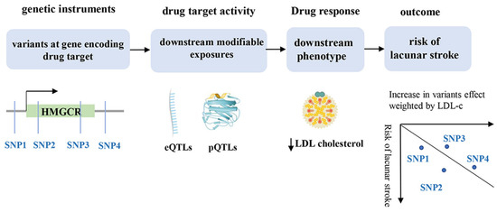 The Mendelian randomization (MR) approach is a popular genetic epidemiological method that uses genetic variants as instrumental variables (IVs) for exposure to assess causal associations between risk factors and disease [4]. This method exploits the random allocation of genetic variants at conception to minimize any bias due to confounding and reverse causation that can restrict causal inference in observational research [5]. Genetic variation in drug-target proteins, such as HMGCR, can be leveraged to extend the application of Mendelian randomization (MR) to investigate drug effects [5,6]. Specifically, single-nucleotide polymorphisms (SNPs) in or near the HMGCR gene were used as proxies for HMGCR inhibition by statins [7]. Drug repurposing, otherwise known as drug repositioning, is a strategy that seeks to identify new indications and targets for approved drugs that are beyond the scope of their original medical indications [8]. Drug repurposing can be a time- and cost-effective way to discover novel therapeutics. Therefore, drug repurposing can be a useful strategy for lacunar stroke by exploring the potential of existing drugs that have already been proven safe and effective in humans [9].