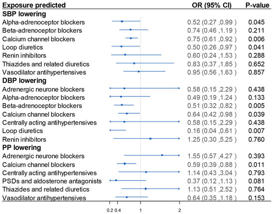 For antihypertensive drug-MR, MR analyses were performed to estimate the effect of a 10 mmHg reduction in blood pressure by antihypertensive drugs. Genetic instruments were selected based on their association with each blood pressure (BP) trait at genome-wide significance (p < 5 × 10−8) and their proximity to genes (near (+/−200 kb) or within encoding protein targets of 12 antihypertensive medication classes. Effect estimates for each genetic variant were derived for each BP trait from the trans-ancestry BP GWAS [21,22,23] (Table S3). The primary analysis focused on the SBP-lowering effect, with sensitivity analyses considering the remaining BP traits (DBP, PP).