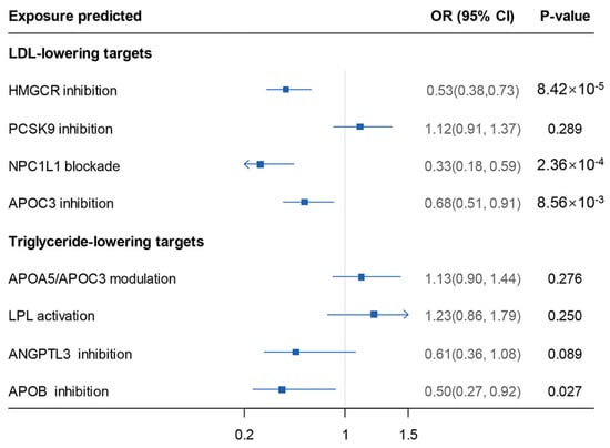 Results of lipid-lowering drug-target MR analysis. Estimated for LDL-lowering target weighted by LDL, triglyceride-lowering target weighted by triglyceride. On the left of x-axis = 1 presented drug use protective, and on the right of x-axis = 1 presented drug use detrimental. MR: Mendelian randomization; LDL: low-density lipoprotein; HMGCR: 3-Hydroxy-3-Methylglutaryl-CoA reductase; PCSK9: proprotein convertase subtilisin kexin type 9; NPC1L1: NPC1-like intracellular cholesterol transporter 1; APOC3: apolipoprotein C3; APOA5: apolipoprotein A5; LPL: lipoprotein lipase; ANGPTL3: angiopoietin-like 3; APOB: apolipoprotein B; OR: odds ratio. 95% CI: 95% confidence interval.