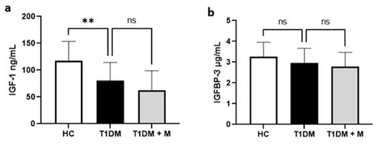 The comparison between HC, T1DM (before metformin), and T1DM + M (after metformin) levels of (a) IGF-1 (ng/mL), and (b) IGFBP-3 (μg/mL). Data are presented as means ± SD and the difference between groups is analyzed by one-way ANOVA with a Tukey test; ** p < 0.01; HC: healthy controls; IGF: insulin-like growth factor; IGFBP: insulin-like growth factor binding protein; T1DM: type 1 diabetic mellitus.