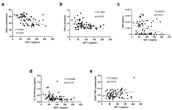 Correlations between IGF-1 levels and levels of (a) HbA1c, (b) TNF-α, (c) CRP (pg/mL), (d) IL-10, and (e) CD34+/100 lymphocytes. Linear regression analyses were performed to assess the correlations. CD: cluster of differentiation; CRP: c-reactive protein; HbA1c: glycated hemoglobin; IGF: insulin-like growth factor; IL: interleukin; TNF-α: tumor necrosis factor-alpha.