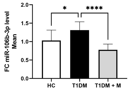 Comparisons of the expression of miR-106b-3p in CFU-Hill colonies in HC, T1DM (before metformin), and T1DM + M (after metformin). Data are presented as means ± SD and the difference between groups is analyzed by one-way ANOVA followed by a Tukey test; * p < 0.05; **** p < 0.0001. FC: fold change; HC: healthy control; T1DM: type 1 diabetes mellitus.