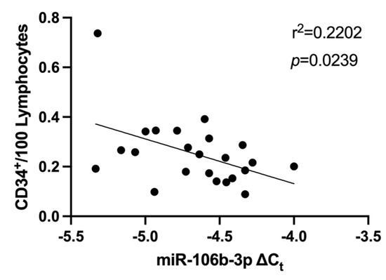 Linear regression analysis showed that miR-106b-3p expression levels in CFU-Hills were significantly negatively correlated with vascular health marker CD34+/100 lymphocytes (p = 0.0239, Figure 5). No significant correlation between miR-106b-3p was detected between the other studied inflammatory or vascular makers; CFU-Hills, cEPC, PAC, FAA, and sICAM-1.