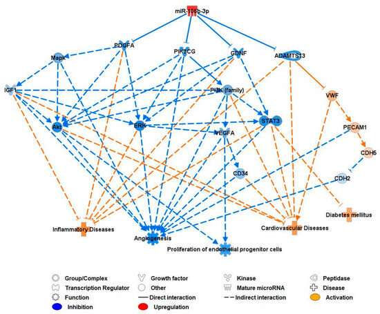 IPA predicted miR-106b-3p to inhibit the expression of PDGFA, PIK3CG, GDNF, and ADAMTS13. These in turn were predicted to inhibit MAPK, ERK, Akt, the PI3K family, STAT3, VEGFA, IGF-1, CDH2, and CD34, and activate vWF, PECAM1 (CD31), and CDH5 (CD144). These all led to the predicted inhibition of angiogenesis and EPC proliferation, and activation of inflammatory disease, diabetes mellitus, and CVD (Figure 6).