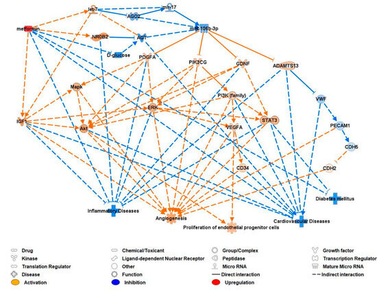 The inhibition of miR-106b-3p by metformin was predicted to occur via indirect activation of let-7 and NR0B2, and inhibition of D-glucose, AGO2, AGT, and mir-17. This downregulation of miR-106b-3p was predicted to activate the expression of PDGFA, PIK3CG, GDNF, AND ADAMTS13. These in turn were predicted to activate MAPK, ERK, Akt, the PI3K family, STAT3, VEGFA, IGF-1, CDH2, and CD34, and inhibit VWF, PECAM1 (CD31), and CDH5 (CD144). These all led to the predicted activation of angiogenesis and proliferation of EPCs, and inhibition of inflammatory disease, diabetes mellitus, and CVD (Figure 7).