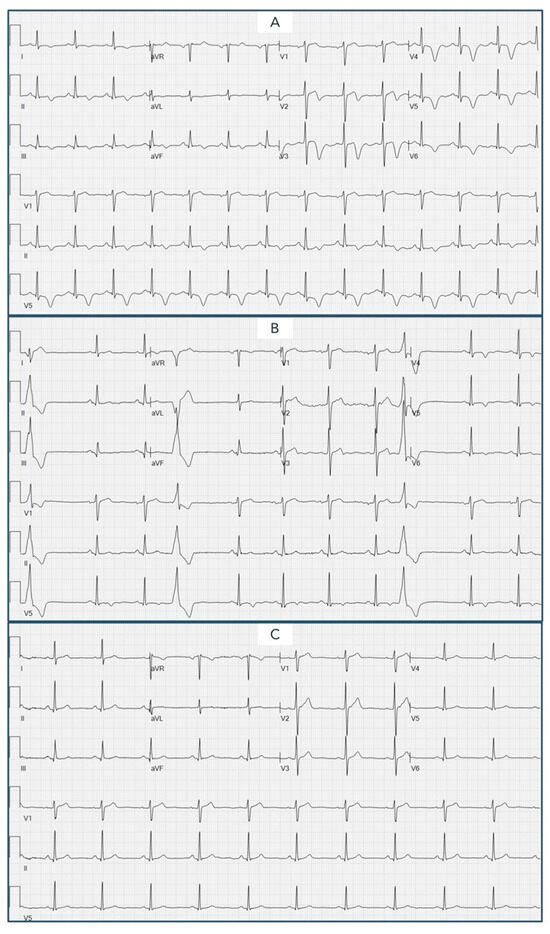On 31 March 2023, the patient entered the emergency department (ED) following the onset of typical chest pain with radiation to the left arm associated with autonomic symptoms, lasting approximately 50 min. The patient reported a similar episode approximately 2 days earlier. In the ED, she performed an ECG that highlighted the presence of diffuse negative T waves (Figure 1), and laboratory tests documented an increase in cardiac biomarkers.
