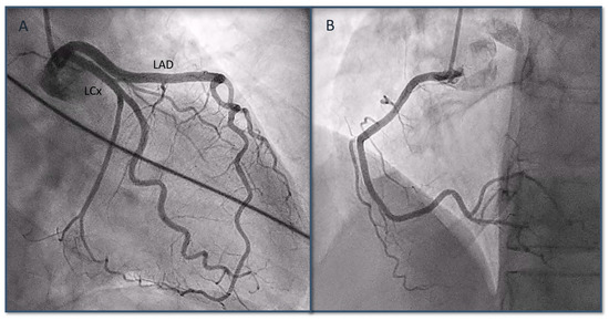 Coronary angiography showing absence of obstructive coronary artery disease in both left coronary artery (A) and right coronary artery (B). LAD: left descending anterior artery; LCx: left circumflex artery.