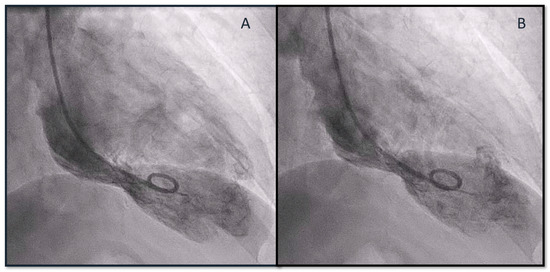 Cine-ventriculography at end-diastole (A) and end-systole (B) showing apical ballooning of apex.