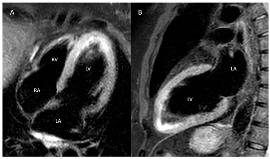 Cardiac magnetic resonance imaging: T2-weighted sequence showing the presence of diffuse edema of the apical segments in both the 4-chamber (A) and 2-chamber (B) long-axis views. LA: left atrium; LV: left ventricle; RA: right atrium; RV; right ventricle.