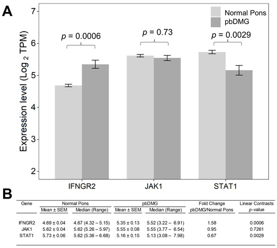 3.3. Amplified Expression of IFNGR2 mRNA in the Brainstem/Pons Region of pbDMG Patients Compared with That in Normal Pons Tissue
