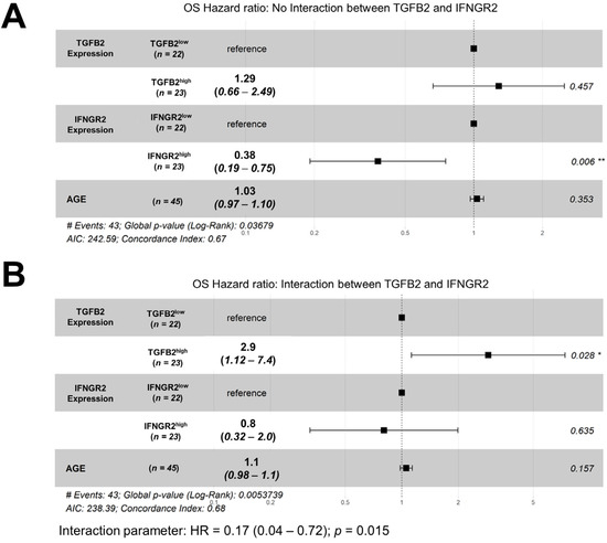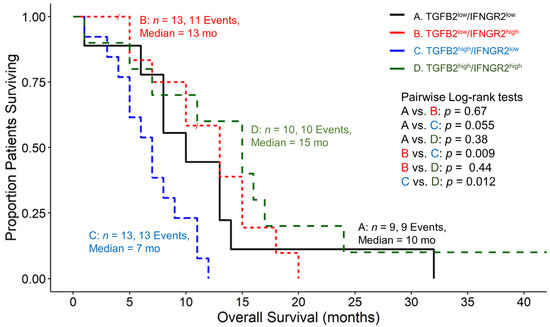 2.4. Multivariate Analysis of OS Outcomes for pbDMG Patients Stratified Relative to TGFB2 and IFNGR2 mRNA Expression Levels and Controlled for Age and Interaction of TGFB2 and IFNGR2