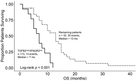 3.4. Amplified TGFB2 Expression in Combination with Reduced IFNGR2 Expression in pbDMG Patients Is Associated with Worse OS Outcomes