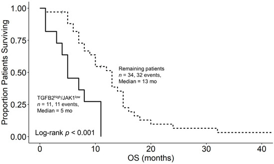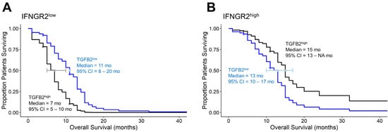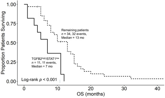 2.3. Overall Survival (OS) Outcomes of pbDMG Patients Stratified Relative to TGFB2 and IFNGR2/JAK1/STAT1 mRNA Expression Levels