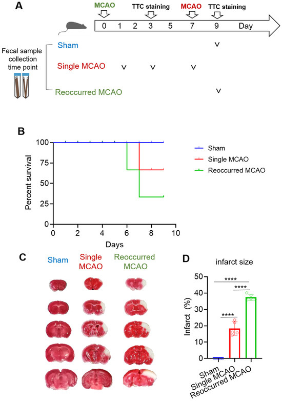 Recurrent ischemic stroke decreases the survival rate and enlarges the infarct size. (A) Schematic diagram of the experimental setup. Mice were randomly divided into three groups. To ensure the success of MCAO surgery, mouse brains were collected for TTC staining on day 3 after the first MCAO surgery (day 3) and 2 days after the second surgery (day 9). For the sham group, fecal samples were collected on day 9. For the single MCAO group, fecal samples were collected on day 1, day 3 and day 7. For recurrent MCAO, fecal samples were collected on day 9. (B) Survival rate. Sham group n = 5; single MCAO group, n = 10; recurrent MCAO group, n = 8. (C) Representative images of the infarction area identified via TTC staining (left) and quantification of brain infarction (right), n = 5/group. (D) Quantification of the infarct size. Blue represents the sham group, red represents the single MCAO group, and green represents the recurrent MCAO group. One-way ANOVA was performed, **** p < 0.0001.