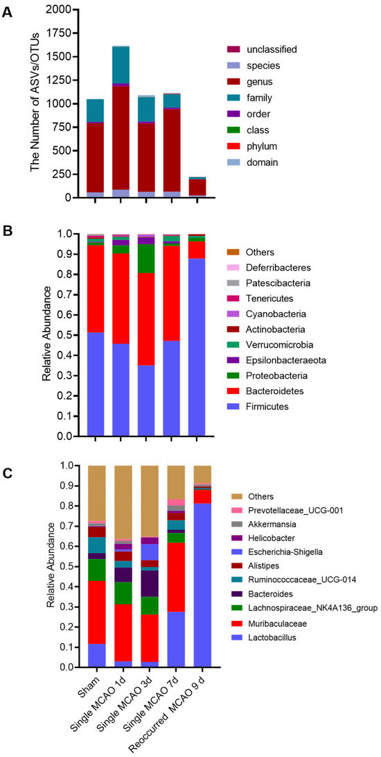 The composition of the gut microbiota population in the sham group, single MCAO surgery group and recurrent MCAO group. (A) The number of microbes. Taxa abundance of each group at various taxonomic levels. (B) Ischemic stroke induces changes in gut microbiota components at the phylum level and (C) genus level.
