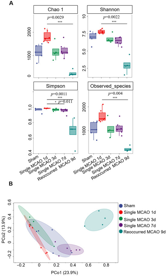 The α-diversity is a metric for microbiome diversity within a sample. In our current study, although, compared to the sham group, we did not observe dramatic changes in diversity after single mild MCAO, there were significant changes after secondary MCAO. These results are consistent with published data based on clinical samples. For instance, there were five independent clinical studies, in which the cohort size was approximately 150–200 people, including both stroke patients and controls, revealing that, after ischemic stroke, the index of α-diversity, such as the Chao1, Simpson or Shannon indices, did not change [25,27,28,29]. It is notable that other clinical studies have reported contradictory results. In a larger scale cohort study, Yin et al. showed that Chao1 and observed species were increased based on 322 stroke patients and 231 controls in a Chinese cohort [30]. In cohort from the Netherlands, Haak et al. reported decreased Shannon and Simpson indices in 349 stroke patients and 51 controls [31]. The possible reasons for this difference may be due to the severity of the ischemic stroke and the sample size. When the ischemia is mild and the population size is relatively small, it may be hard to notice changes. Nevertheless, when the ischemia is severe, such as the recurrent MCAO in our current study, the α-diversity experiences a sharp decrease.