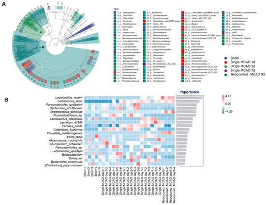 Differentially abundant gut microbiota among the groups. (A) LEfSe analysis shows the classification of the microbiota among the sham control group, single MCAO surgery group and recurrent MCAO group. The blue dots represent the sham group, the red dots represent fecal samples collected from mice 1 day after single MCAO, the green dots represent fecal samples collected from mice 3 days after single MCAO, the purple dots represent fecal samples collected from mice 7 days after single MCAO, and the cyan dots represent fecal samples collected from mice 2 days after recurrent MCAO. (B) In the diagram, the abscissa of the histogram is the importance score of the species to the classifier model, and the ordinate is the ASV/OTU (default) or the taxon name at the phylum, class, order, family, genus or species level. The heatmap shows the distribution of the abundance of these species in each sample/group. From top to bottom, species have diminished importance to the model, and these highest importance species can be considered to be markers of differences between groups.