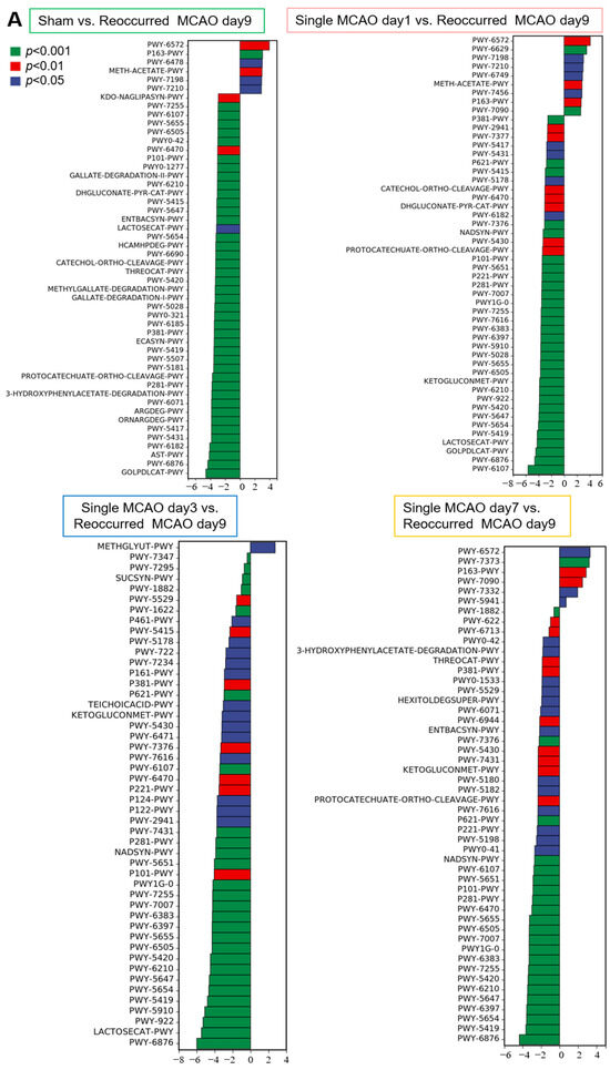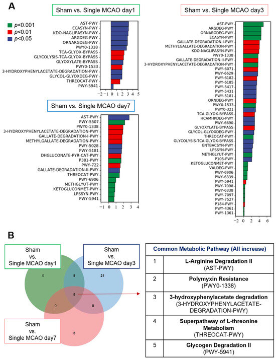 The gut microbiota is commonly accepted as an essential regulator of metabolism, considering that various microorganisms are involved in different biological processes, as well as the elucidation of metabolic pathways. Therefore, based on the 16S sequencing data, we further explored how the altered gut microbiota influences metabolic pathways (Figure 5 and Figure 6). Our data showed that, compared to the mice in the sham control group, for the mice in the one-time MCAO group, the most dramatic changes occurred 3 days after MCAO. There were more than 40 metabolic pathway changes after 3 days, and fewer than 20 metabolic pathways were altered on day 1 and day 7 after mild stroke compared with the sham control group (Figure 5A). Among these pathways, five metabolic pathways were significantly upregulated on all three days after MCAO compared to the sham control group (Figure 5B). These metabolic pathways included L-arginine degradation, polymyxin resistance, 3-hydroxyphenylacetate degradation, the superpathway of L-threonine metabolism and glycogen degradation (Figure 5B).