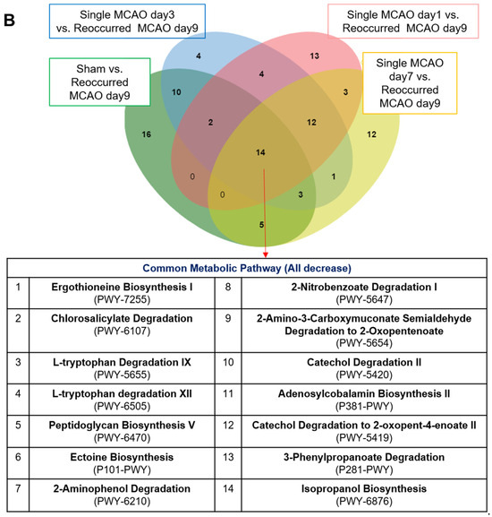Metabolic pathway differences analysis among the different groups. (A) Metabolic pathway differences analysis. The differences in metabolic pathways enrichment between the recurring MCAO group and the sham control group were as follows: mice after single MCAO for 1 day, mice after single MCAO for 3 days and mice after single MCAO for 7 days. (B) Venn diagrams showing the commonly altered metabolic pathway numbers when ischemic stroke occurred (upper) and the detailed pathway list (lower).