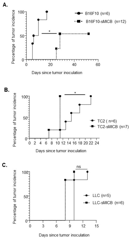 Overexpression of the soluble human NKG2D ligand sMICB differentially impacts tumor incidence and the time of tumor onset in different tumor models. Comparison of tumor incidence between parental tumors and sMICB overexpressing tumors. The percentage of mice that remained tumor free over time was compared. Tumors were subcutaneously inoculated with three disease models: (A) melanoma model B16F10 vs. B16F10-sMICB with 5 × 105 cells/mouse being inoculated; (B) prostate tumor model TRAMP-C2 (TC2) vs. TRAMP-C2-sMICB (TC2-sMICB) with 1 × 106 cells/mouse being inoculated; and (C) lung tumor model LLC vs. LLC-sMICB with 5 × 105 cells/mouse being inoculated. Note that the number of cells being inoculated with each model was based on the published literature. Tumor incidence was accounted when the tumors were palpable. Tumor incidence was determined via Kaplan–Meier analysis with “tumor incidence” as an occurring event. The Mantel-Cox Log-rank test was used to analyze the significance level of tumor incidence among two groups (ns, not significant). * p < 0.05.