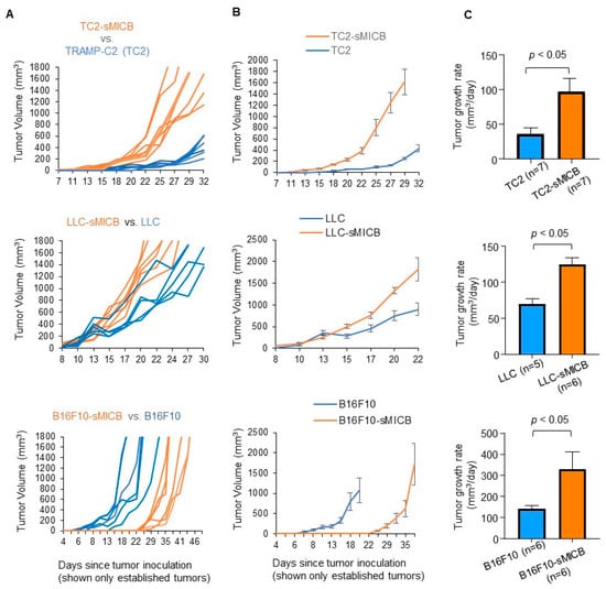 In contrast to the B16F10-sMICB melanoma model, the prostate TRAMP-C2-sMICB (TC2-sMICB) cells presented a significantly more rapid tumor onset than the parental TRAMP-C2 (TC2) cells after inoculation (p < 0.05, Figure 1B). Specifically, TC2-sMICB tumors arose as early as day 7 post inoculation and reached 100% tumor penetration by day 11, whereas parental TC2 tumor onset did not occur until day 11 and did not reach 100% tumor penetration until day 22 post inoculation (p < 0.05, Figure 1B). Interestingly, different from the B16F10-sMICB or the TC2-sMICB models, no significant difference in tumor establishment or tumor onset was observed between LLC-sMICB and the parental LLC tumors. LLC-sMICB and the parental LLC tumors displayed a similar timeline in tumor establishment, both of which reached 100% tumor penetration within 12 days post tumor inoculation (Figure 1C). Together, these data demonstrated a model-dependent effect of sMICB on tumorigenicity or tumor initiation.