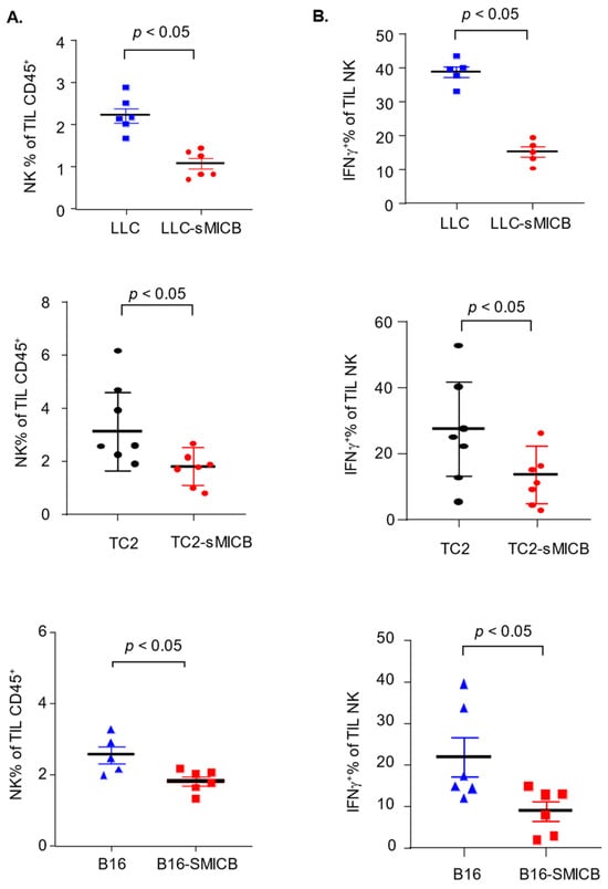 Irrespective of tumor incidence or the time of tumor onset, once tumors were initiated or formed, in all three disease models, sMIC-overexpressing tumors grew at a significantly more aggressive rate than the parental sMIC-negative tumors (Figure 2). The accelerated tumor growth with sMIC overexpression is in agreement with previous studies by multiple investigators in various experimental settings demonstrating that tumor produced sMIC can significantly comprise NK and CD8 T cell function [,,,,,,,,,]. To validate that the more aggressive tumor growth of sMICB-expressing tumors in current experimental settings is associated with impairment of NK and CD8 T cell immunity, we assayed the function of tumor-infiltrated NK and CD8 T cells (Supplement Figure S2), both of which express the receptor NKG2D for sMICB and are critical anti-tumor effector cells. In all three models, there was a significant reduction in NK cell content in tumor infiltrates when tumor cells expressed sMICB (Figure 3A, p < 0.05 for all models), which is consistent with the previous finding in the TRAMP/MICB autochthonous tumor model that tumor-produced sMIC impairs the NK cell’s homeostatic self-renewal ability []. NK cells in sMICB-expressing tumors had a significantly reduced response to PMA/I stimulation as measured by IFNγ expression (Figure 3B, p < 0.05 for all models), one of the key effector molecules for NK cell mediating anti-tumor immunity. sMIC expression also significantly impaired tumoral CD8 T cell response to PMA/I stimulation as measured by IFNγ expression (Figure 4A, p < 0.05 in all models); however, CD8 T cell content in tumor infiltrates was not significantly impacted by sMICB (Figure 4B). The impaired response to external PMA/I stimulation ultimately signifies the comprised ability of these cells to respond to tumor-specific stimulations in vivo. To support this concept, we conducted representative analyses of TRAMP-C2 and TRAMP-C2-sMICB tumoral NK and CD8 T cell IFNγ and granzyme B expression in an ex vivo setting without PMA/I stimulation. Corroboratively, the ability of tumoral NK and CD8 T cells to produce IFNγ and granzyme B without PMA/I stimulation was shown to be significantly compromised in TRAMP-C2-sMICB tumors as compared to TRAMP-C2 tumors (Supplement Figure S3). Collectively, these data re-reinforce the concept that soluble human NKG2D ligands negatively regulate anti-tumor NK and CD8 T immunity in established tumors with more profound impact on NK cells.
