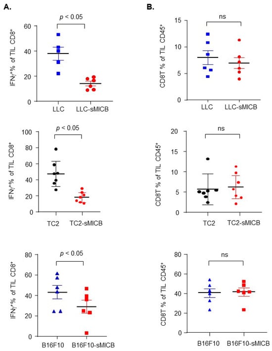 Impaired CD8 T cell function but not CD8 T cell content in established sMIC-positive tumors across models. (A) Significantly (p < 0.05) reduced ability of IFNγ production of tumoral CD8 T cells from sMICB-expressing tumors as compared to parental sMIC-negative tumors. (B) No significant difference in tumor CD8 T cell content between sMIC-expressing tumor models as compared to their parental models (p < 0.05), ns: no significance. Statistical significance was determined by unpaired t-test.
