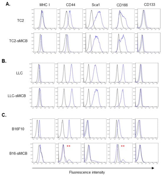Stem cell marker comparison of TRAMP-C2 (TC2)-sMICB (A), LLC-sMICB (B), and B16-sMICB (C) with respective parental counterparts. The established mouse tumor cell stem cell markers SCA1, CD166, and CD133 were characterized by flow cytometry assay. Black profile represents control IgG staining. Blue profile represents specific marker staining. Surface MHCI was also characterized as a positive staining control. MFI, Mean Fluorescence Intensity. ** indicates differences in expression levels with the respective comparing counterpart.