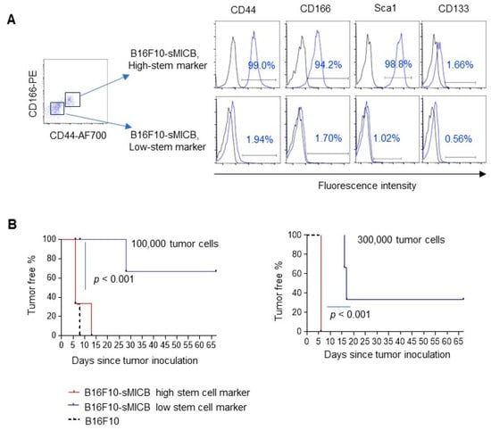 Tumor cell stemness impacts the tumorigenic potential of B16-sMICB tumors. (A) Flow-cytometry sorted B16-sMICB cells with low expression of surface stem cell markers (CD44LoCD166Lo) and high expression of surface stem cell markers (CD44HiCD166Hi). (B) Tumorigenic ability of B16F10-sMICB tumors with Hi-stem cell markers and Lo-stem cell markers that are inoculated with 300,000 cells and 100,000 cells, respectively. N = 6, six mice per group. Tumor incidence was determined via Kaplan–Meier analysis with “tumor incidence” as an occurring event. Mantel-Cox Log-rank test was used to analyze the significance level of tumor incidence among two groups.
