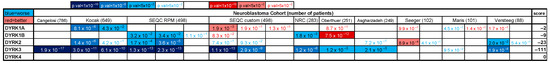 Bonferroni adjusted p-values for the correlations between DYRK family member expression and NB patient survival probability (pseudo-heatmap). Values highlighted in blue denote significant negative correlations (higher expression = reduced survival probability ‘worse’), while values highlighted in red denote positive correlations (higher expression = increased survival probability ‘better’). Blue/red fonts denote non-significant values (bonf. p-value > 5.00 × 10−2). Scores are arbitrary units based on the number of datasets showing one or more significant correlations for a given gene, and the value of such significance as previously described [2]. We arbitrarily define that a gene must be significantly correlated to either a better or a worse outcome in at least five independent cohorts, and obtain a minimum of 50 points (either positive or negative, respectively), to be considered a significant hit.