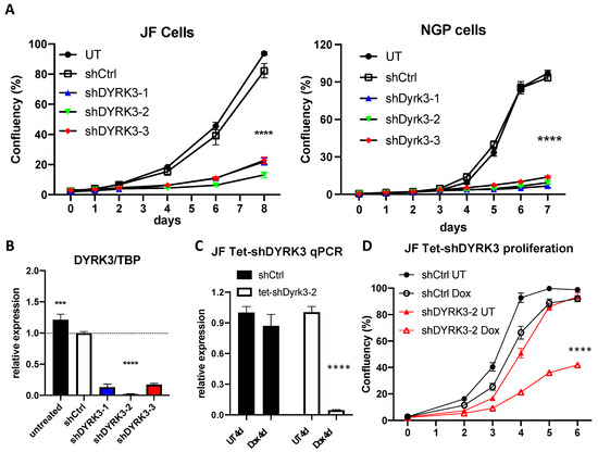 (A) NGP and JF neuroblastoma cells were left untreated (UT) or transduced with lentiviral vectors for expression of the indicated shRNAs. After puromycin selection, ~2 × 103 cells were plated on M96 well plates (4 replicates/condition) and allowed to grow for 8 days. Confluency of each well was measured in an Image cytometer (Celigo, Nexcelom). (B) JF cells form A were collected in triplicate and processed for RNA extraction and qRT-PCR analysis of DYRK3 expression (vs. the housekeeping gene TBP). (C) Tetracycline-inducible shRNA system validation by qRT-PCR for DYRK3/TBP expression demonstrated efficient and specific DYRK3 downregulation upon doxycycline treatment (1 μg/mL) of Tet-shDYRK3-expressing cells. (D) Tet-shRNA-expressing cells (shCtrl vs. shDYRK3) were plated on M96 well plates (4 replicates/condition) and allowed to grow for 6 days in the absence or presence of doxycycline. Confluency of each well was measured as in A. *** = p value > 0.001; **** = p value > 0.0001.