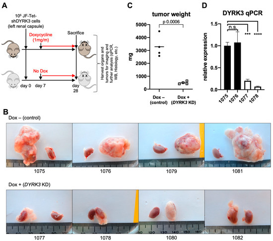 One million Tet-shDYRK3 JF cells suspended in 0.1 mL of PBS were surgically implanted in the left renal capsule of NSG immunodeficient mice (The Jackson Laboratory (Bar Harbor, ME, USA) #005557), as previously described [18]. After 7 days, mice were randomly divided into ‘control’ (untreated) group vs. ‘doxy’ group, receiving 1 mg/mL doxycycline in the drinking water for 3 additional weeks. The body weight of mice was monitored weekly. At the end of the treatment, all mice were euthanized. Tumors and the right kidneys (control) were dissected and weighed. All procedures were approved by the Institutional Animal Care and Utilization Committee (IACUC) at UMass Chan Medical School and according to our IACUC approved protocol (A3306-01).