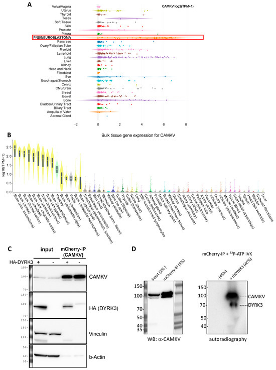 (A) Expression of CAMKV across different cancer cell lines from the depmap portal (depmap.org) demonstrates a high and specific expression in neuroblastoma cell lines (red frame) as compared to most other cancer cell lines. (B) Analysis of CAMKV expression across human tissues from the Genotype-Tissue Expression Portal (gtexportal.org) demonstrates that CAMKV expression is exclusively enriched in brain tissues. (C) Immunoprecipitation studies in NGP NB cells overexpressing mCherry-CAMKV WT +/− HA-DYRK3 demonstrate DYRK3 (HA) co-precipitation with mCherry (CAMKV) immuno-complexes. (D) In vitro kinase assay with radioactive [γ-32P]-ATP, in the absence or presence of recombinant human DYRK3 confirmed the direct in vitro phosphorylation of CAMKV by DYRK3.