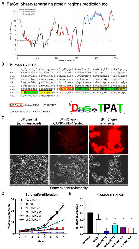 Given the known roles for DYRK3 as a critical regulator of the liquid–liquid phase separation (LLPS) behavior of its substrates, we then focused on CAMKV’s protein sequence. Barylko et al. [21] recently reported a predicted intrinsically disordered region of ~200 amino acids in CAMKV’s C-terminal half. We employed bioinformatic tools for the prediction of LLPS formation —ParSe (phase-separating protein regions prediction tool; Figure 5A)— or for prediction of disordered regions —PONDR® (Predictor of Natural Disordered Regions) and PrDOS (Protein DisOrder prediction System; Supplementary Figure S6)—, which further confirmed the presence of a highly disordered C-terminal region likely capable of undergoing phase separation in a phosphorylation-regulated manner. Upon a deeper look, we identified seven tandem repeats of an octapeptide motif (D-X-X-X-T-P-A-T), including two canonical and five highly related DYRK phosphorylation motifs (Figure 5B). In fact, in the original characterization of rat Camkv, Godbout et al. [22] briefly described such region as a potential ‘PEST sequence’, a motif known to act as a signal for degradation in proteins with a short half-life [23,24]. In this context, our overexpression experiments with the lentivirally encoded mCherry-CAMKV WT construct suggested CAMKV as a very stable protein (see below), as demonstrated by the high and constant expression of mCherry-CAMKV across many passages with no loss (but rather increase) of the signal with time. Furthermore, in an attempt to characterize the role of these unique tandem motifs, we generated an overexpression mutant version, ‘mCherry-CAMKV-∆IDR’, lacking the 56 amino acids corresponding to the seven tandem octapeptide repeats. Surprisingly, the mutant variant exhibited a very low to null expression, suggesting that the resulting protein was very unstable (Figure 5C), and confirming that the seven tandem octapeptide repeats are needed for expression or stabilization—and likely function—of CAMKV, and not acting as a canonical PEST sequence. Interestingly, shRNA-mediated downregulation of CAMKV by shRNA lentiviral vectors also resulted in a striking impairment of NB cell proliferation (Figure 5D). Of note, the level of CAMKV downregulation by different shRNA efficiencies (Figure 5E) was nicely correlated to the degree of proliferation potential of these cells (Figure 4D), suggesting that CAMKV is required for NB cell proliferation or survival in an expression level-dependent fashion.
