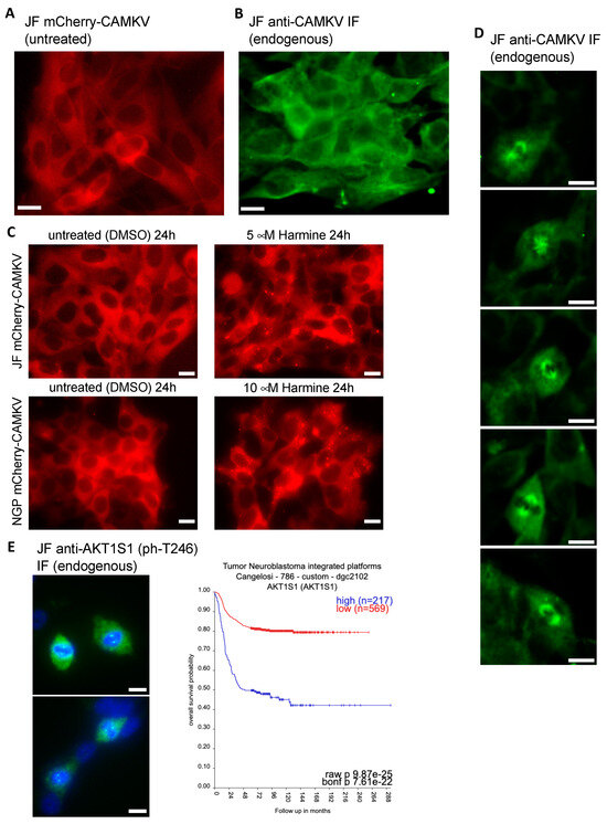 (A) Fluorescence image of live JF cells transduced with a lentiviral vector for expression of mCherry-CAMKV (WT), demonstrating a homogeneous cytosolic distribution of the mCherry signal. (B) JF cells were fixed and processed for fluorescent immuno-staining of endogenous CAMKV, again showing a widespread cytosolic localization in interphasic cells. (C) mCherry-CAMKV JF and NGP cells were left untreated (left panels) or treated with the indicated final concentrations of Harmine for 24. Harmine treatments induced a relocalization of CAMKV from a homogeneous distribution into numerous aggregates (see Supplementary Videos and Figure S7). (D) Same cells from (B) demonstrating a clear mitotic spindle localization of CAMKV in cells undergoing cell division. (E) Left panel: same cells from (B,D) were processed for fluorescent immuno-staining of endogenous phospho-AKT1S1 (Thr 246), showing a clear mitotic spindle pole localization in cells undergoing cell division. Scale bar = 10 μm. Right panel: Kaplan–Meier plot for the correlation between AKT1S1 expression and NB patient survival probability in the Cangelosi 786 cohort, as obtained from the ‘R2: Genomics Analysis and Visualization Platform’ (https://hgserver1.amc.nl/cgi-bin/r2/main.cgi (accessed on 2 September 2023)).