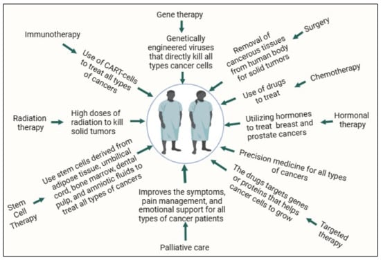 Moreover, early identification of cancer frequently results in improved treatment outcomes. The treatment options for cancer differ, according to the nature and stage of the disease. Stem cell transplantation, radiation therapy, chemotherapy, targeted therapy, immunotherapy, and hormone therapy are the most common therapeutic techniques []. Possible treatment modalities include a combination of these methods. Prolonged investigations pertaining to the etiology, prevention, and therapeutic aspects of cancer have recently yielded noteworthy progress. These include the advancement of precision medical strategies, targeted medicines, and immunotherapies []. The prognosis of many cancer patients has substantially improved as a result of ongoing research and advancements in medical therapies, despite the fact that cancer continues to be a major worldwide health concern. Advancements in cancer therapy, early detection, and prevention are critical components of the ongoing battle against this disease. Oncology therapy, or cancer therapy, encompasses a range of medical procedures and therapies implemented to control and eradicate cancer []. Cancer type and stage, in addition to the patient’s general health and treatment objectives, influence treatment selection. Cancer therapy can be classified into several primary categories, on a large scale. Surgical techniques to remove malignant tumors and surrounding tissues comprise the first category []. Surgery is often the primary treatment for solid tumors such as breast cancer, lung cancer, and colon cancer. It can also be used for diagnostic purposes, staging, and alleviation of symptoms and complications [,]. The second type is radiation therapy, or radiotherapy, which uses high-energy beams of radiation to target and kill cancer cells [,]. It can be used as a monotherapy or in combination with other therapies. Radiation therapy is often employed for localized tumors, and may be administered before or after surgery. The third category is chemotherapy, which involves the use of drugs to destroy cancerous cells or inhibit their growth [], which can be administered either orally or parentally. Chemotherapy is often used for systemic or metastatic cancers, but can also be part of adjuvant therapy following surgery. The fourth category is immunotherapy, or biological therapy, which harnesses the body’s immune system to recognize and attack cancer cells []. These include monoclonal antibodies, checkpoint inhibitors, cytokines, and cancer vaccines. Immunotherapy has shown remarkable improvement in treating various cancer types, including melanoma, lung cancer, and some types of leukemia. The fifth category is targeted therapy, which uses drugs that specifically target cancer cells by interfering with the molecules or pathways that drive their growth and spread []. These drugs are often more precise and have fewer side effects than traditional chemotherapies. Targeted therapies are used to treat tumors with specific genetic mutations or other targetable characteristics. The sixth type is associated with the use of hormones, which are primarily used for hormone-sensitive cancers, including breast and prostate cancer []. This involves medications that block the effects of hormones or reduce their production, as hormones can fuel the growth of certain cancers. The seventh category is known as stem cell transplantation (bone marrow transplantation), which is used to replace damaged or cancerous bone marrow with healthy stem cells []. It is often used in the treatment of blood-related cancers, including leukemia and lymphoma. The eighth type is precision medicine, which involves tailoring cancer treatment to an individual’s specific genetic and molecular profiles []. This approach aims to maximize the effectiveness of the therapy while minimizing side effects. The ninth type is palliative care, which is an indispensable component of cancer therapy that emphasizes improving the quality of life of patients with advanced or terminal cancer []. It addresses symptoms, pain management, and emotional support, and may be combined with curative treatments. Cancer therapy is also known as multimodal therapy, often administered as a combination of these treatments, which are summarized in Figure 1.