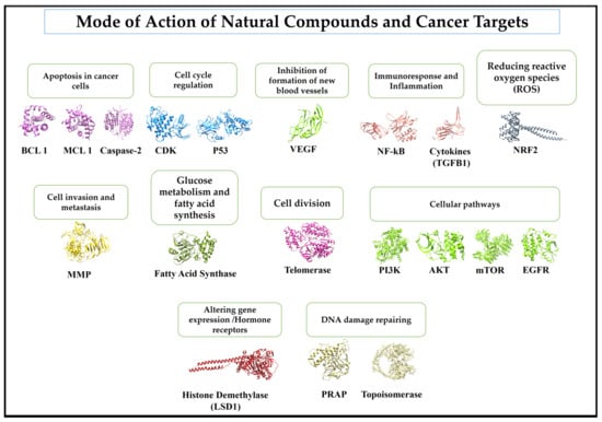 Natural products have several advantages in drug discovery, including structural diversity, potential for multi-target effects, and the presence of compounds that can overcome drug resistance. However, the challenges in sourcing and standardizing natural products, as well as issues related to patent protection, can complicate their development as anticancer drugs. Nevertheless, ongoing research in this field continues to yield promising results for novel cancer treatments. These compounds can interact with various molecular pathways and cellular processes associated with cancer development and progression (Figure 3). The common mode of action for some cancer targets are like the following: Bcl-2, Bcl-xL, and Mcl-1, and the activation of caspases enzymes to induce apoptosis in cancer cells []; inhibiting the cell cycle regulating enzymes/proteins such as cyclin-dependent kinases (CDKs) and p53 []; inhibiting the formation of new blood vessels in tumor cells by inhibiting enzyme-like vascular endothelial growth factor (VEGF) [], by targeting proteins associated with immunoresponse and inflammation such as nuclear factor-κB (NF-κB) and cytokines []; reducing reactive oxygen species (ROS) and increasing the anti-oxidation defense against cancer-spreading cells []; inhibiting cancer cell invasion and metastasis by inhibiting group of enzymes known as matrix metalloproteinases (MMPs) and increasing the activity of Tissue Inhibitors of Metalloproteinases (TIMPs), which counter the effects of MMPs []; inhibition of DNA-damage-repairing enzyme such as poly(ADP-ribose) polymerase (PARP) []; altering gene expression in cancer cells by modifying DNA methylation and histone acetylation involved in epigenetics [], in breast- and prostate-cancer natural-product target hormone receptors like estrogen and androgen receptors []; by interfering in cellular pathways such as PI3K/Akt/mTOR and the EGFR (Epidermal Growth Factor Receptor) pathway [,,]; by inhibiting telomerase, an enzyme which helps to divide tumor cells indefinitely []; by inhibiting glucose metabolism and fatty acid synthesis [,]; and by inhibiting the topoisomerase group of enzymes to maintain damaged-DNA repair and replication [,].