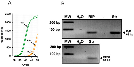 In order to assess whether the PTB protein binds to D3R mRNA, we conducted an RIP (RNA immunoprecipitation) procedure. After the RIP procedure, the presence of the D3R transcript was evaluated through qRT-PCR (see Section 2). The amplification of the D3R transcript indicates that D3R mRNA co-precipitates with PTB (Figure 1A). In order to confirm that the results of the qRT-PCR were not a nonspecific product, we evaluated the molecular weight of qRT-PCR products by agarose gel electrophoresis. We used cDNA from striatum tissue as a control. As observed, the molecular size of the amplicons from the RIP or striatum tissue presents the same molecular weight, corroborating the findings (Figure 1B).