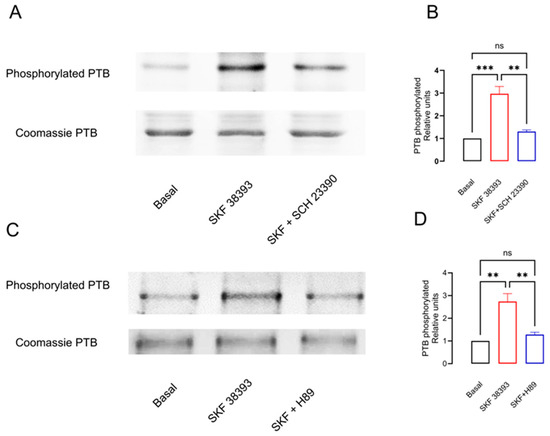 Activation of D1R by SKF 38393 phosphorylates PTB by PKA. (A,C) Representative blots of PTB phosphorylation in homogenates from striatal slices treated with the D1R agonist SKF 38393 and the D1R antagonist SCH 23390 or the PKA blocker H89. (B,D) The densitometry analysis from three blots. ** p < 0.01; *** p < 0.001; ns: not significant differences. (B) F = 30.96, p = 0.0007; (D) F = 19.86, p = 0.0023, One-way ANOVA, followed by Tukey’s test, n = 3.