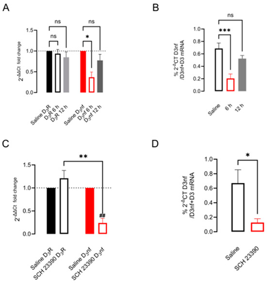 D1R receptor blockade with SCH 23390 decreases D3nf mRNA expression and relative expression concerning D3R mRNA. (A) The effect of a single dose of the D1R antagonist SCH 23390 with respect to saline in striatal D3nf and D3R mRNAs at 6 and 12 h after injection. (B) The D3nf/D3R+D3nf ratio of the relative expression of the isoforms. (C,D) The same determinations after a 5-day two-dose antagonist treatment. * p < 0.05; ** p < 0.01; *** p < 0.001; ns: not significant; ## p < 0.01 with respect to the indicated group. (A) F = 4.29, p = 0.0056; (B) F = 10.25, p = 0.0021; (C) F = 18.72, p < 0.0001. One-way ANOVA, followed by Tukey’s test, n = 3–6 determinations, (D) t = 4.91, df = 6, unpaired t-test n = 4.