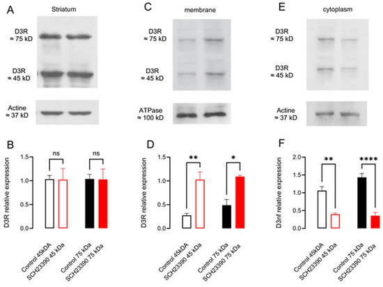 D1R blockade with SCH 23390 did not change striatal D3R protein expression but increased it in the membrane. (A,C,E) WB from D3R protein from total striatal homogenates and protein fraction from striatal membranes or cytoplasm, respectively; the 45 kD bands represent the D3R monomeric forms and the 75 kD bands represent the dimeric forms. (B,D,F) The densitometry analysis. * p < 0.05; ** p < 0.01; **** p < 0.0001; ns: not significant. (B), F = 0.001, p > 0.999; (D), F = 15.22, p = 0.0011; (C), F = 31.73, p < 0.0001. One-way ANOVA, followed by Tukey n = 3.