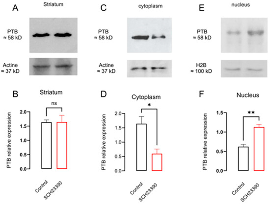 The effects on PTB protein expression via D1R blockade are shown in Figure 6. First, SCH 23390 treatment did not modify the protein expression in whole striatum tissue (Figure 6B: PTB relative expression with respect to actine control 1.64 ± 0.08 vs. SCH 23390-treated 1.64 ± 0.23, p = 0.98, t = 0.03, n = 3. Unpaired t-test). Nevertheless, it decreases protein in the cytoplasm and increases it in the nuclear fraction (Figure 6D: PTB relative expression with respect to actine control in the cytoplasm 1.64 ± 0.25 vs. SCH 23390-treated 0.59 ± 0.16, p = 0.025, t = 3.50, n = 3; Figure 6F: PTB relative expression with respect to actine control in nucleus 0.62 ± 0.06 vs. SCH 23390-treated 1.13 ± 0.06, p = 0.004, t = 5.70, n = 3. Unpaired t-test). Figure 6A,C,E represent representative Western blots.