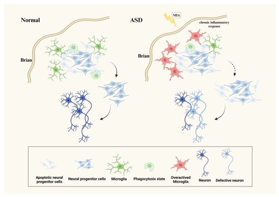 Microglia directly regulate neurogenesis through phagocytosing neural stem cells during neurogenesis, and only the last surviving neural progenitors can continue to differentiate into mature neurons. MIA causes ASD-like behavior in offspring, triggers a chronic proinflammatory response during fetal development. The overactivation of microglia can negatively regulate synaptic pruning and neurogenesis by altering the expression of key phagocytic genes. In ASD, the abnormal activation of microglia can result in abnormal nerve development and impaired neuronal function.