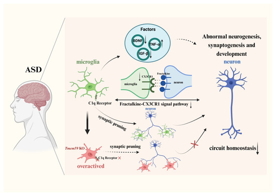 Microglia play a crucial role in synaptic pruning and the maintenance of circuit homeostasis in ASD. They promote brain development and nerve repair, regulate neuronal activity, and prune synapses by secreting a variety of factors. In ASD brains, microglia secrete abnormal factors, such as reduced levels of BDNF, which leads to impaired synaptic function. The reduced expression of IGF-1 and increased secretion of TNF-α increase neuroinflammation. Alterations in growth factors can alter homeostasis in the brain and induce ASD-like behaviors. Due to the reduced expression of CX3CR1 and inhibition of fractalkine-CX3CR1 signaling, microglia–neuron interactions are reduced in ASD. This reduction also affects synaptic pruning mediated by microglia–neuron interactions, causing impaired neuronal function. In addition, microglia can also prune synapses through the complement cascade pathway and mainly rely on C1q and C3 receptors to function. Tmem59 KO mice, which induce ASD-like behavior, have abnormal expression of C1q receptor and lead to abnormal synaptic phagocytosis of microglia, resulting in abnormal synaptic pruning function during neural development.