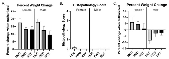 3.2. Male Mice Lose Significantly More Weight Than Female Mice Regardless of RST Exposure