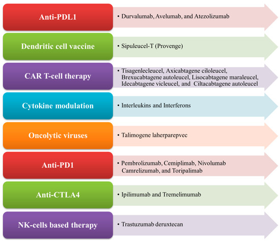 Immunotherapy is an important therapeutic strategy where extrinsic therapeutic substances either stimulate or repress the immune system to combat tumors, infections, as well as other disease ailments [1]. Immunotherapy has transpired to be the touchstone in the treatment of cancer, unlike other traditional treatment options such as targeted therapy, radiation therapy, and chemotherapy, which are emerging dynamic fields in the biopharmaceutical industry [2,3]. Cancer immunotherapy is a promising and advantageous tool for tumor treatment which acts by boosting the immune system to generate antitumor effects against tumor cells [4]. Nowadays, it gains more traction than other cancer treatments due to its ability to enhance patients’ overall survival as well as their quality of life [5]. The mechanism of antitumor immunity involves the presentation of tumor-specific antigens (TSAs) and tumor-associated antigens (TAAs) by antigen-presenting cells (APCs) such as dendritic cells and macrophages to cytotoxic T lymphocytes (CTLs) and helper T cells, thereby exerting its antitumor effects [6]. There exist various types of immunotherapy approaches in treating cancer of any origin through T-cell transfer therapy, monoclonal antibodies (mAbs), natural killer (NK) cell therapy, dendritic cell (DC)-based vaccines, gene-editing using clustered regularly interspaced short palindromic repeats-CRISPR- and its associated protein-9 (CRISPR-Cas9) technology, immune checkpoint inhibitors, as well as other cancer vaccines [7,8]. In the case of advanced tumors of various origins, the accepted treatment regime employs immune checkpoint inhibitors (ICPs or ICIs), which are well known to target programmed cell death protein 1 (PD-1)/programmed cell death-ligand 1 (PD-L1) and cytotoxic T-lymphocyte associated antigen 4 (CTLA-4) [9]. More recently, in 2020, globally active chimeric antigen receptor (CAR) T cell therapies were clinically employed to treat patients, which also encompassed advanced precision medicine immunotherapy measures like the use of checkpoint inhibitors [10,11]. The mechanism of CAR T cells involves the adoptive transfer of modified T cells, i.e., chimeric antigen receptor (CAR) T cells intended towards the cluster of differentiation 19 (CD19), which is currently authorized to cure patients with advanced B cell lymphoma and refractory B cell acute lymphoblastic leukemia-ALL [12]. In cancer immunotherapy, the DC-based therapy is specifically used to treat prostate cancer. The NK-cell-based therapy involves the modification of NK cells and enables the clinical treatment of different cancer types like breast cancer, ALL, neuroblastoma, gastrointestinal (GI)-tract cancer, etc. [13]. Nowadays, CRISPR Cas-9 technology is widely used to inactivate oncogenes by editing tumor genes with the Cas-9 endonuclease (RNA-guided mechanism) [14]. Some of the FDA-approved immunotherapies for the treatment of different types of cancer conditions, along with their mechanisms, are illustrated in Figure 1.