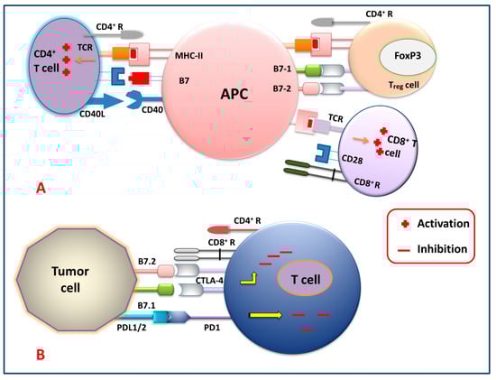 Immune checkpoint signaling pathways. (A) T cell (CD4+, Treg and CD8+) activation by APC, and (B) T cell inhibition by tumor cells via targeting several immune checkpoint signaling pathways.